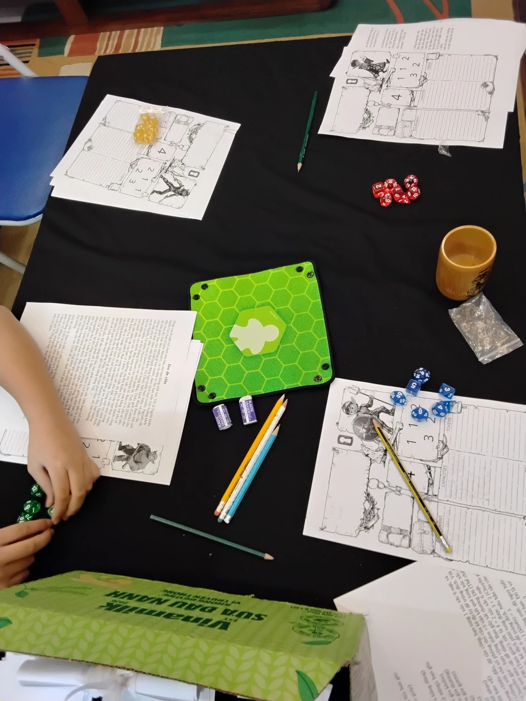 The problem is, it's a game based on imagination. You have a pencil, paper, dice, and an interactive story. The Game Master has to describe, narrate, and play the characters you meet. See the problem? My Vietnamese is terrible, and the boys' French isn't advanced enough to follow the complex description of a gloomy forest. :)