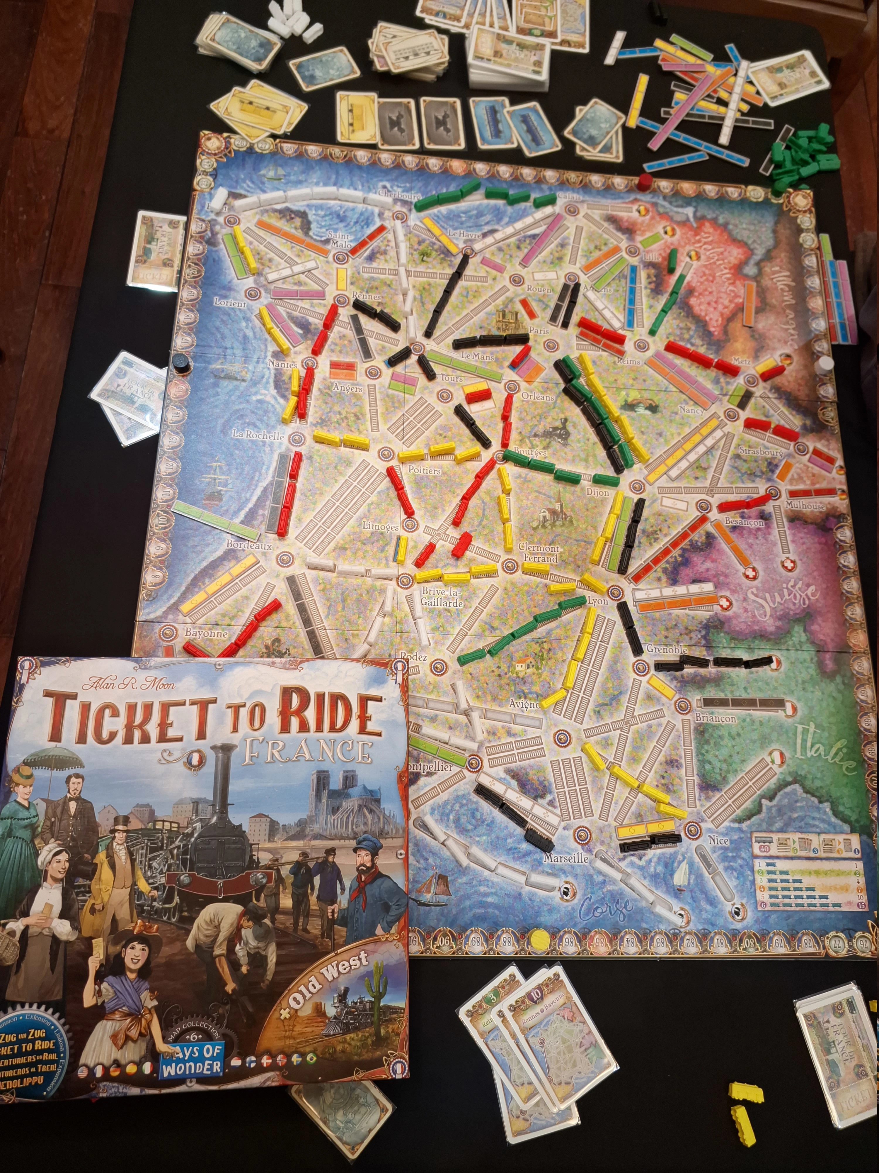 The variant is quite fun. There are track layouts, some of which overlap, but you can't build on them until you place a colored track strip. And of course, as soon as a track strip is placed, any other tracks that intersect it can't be built. This lets you choose the color of your route, but it also shows others where you want to go. This placement also allows you to temporarily block opponents who don't have the color of the track strip.